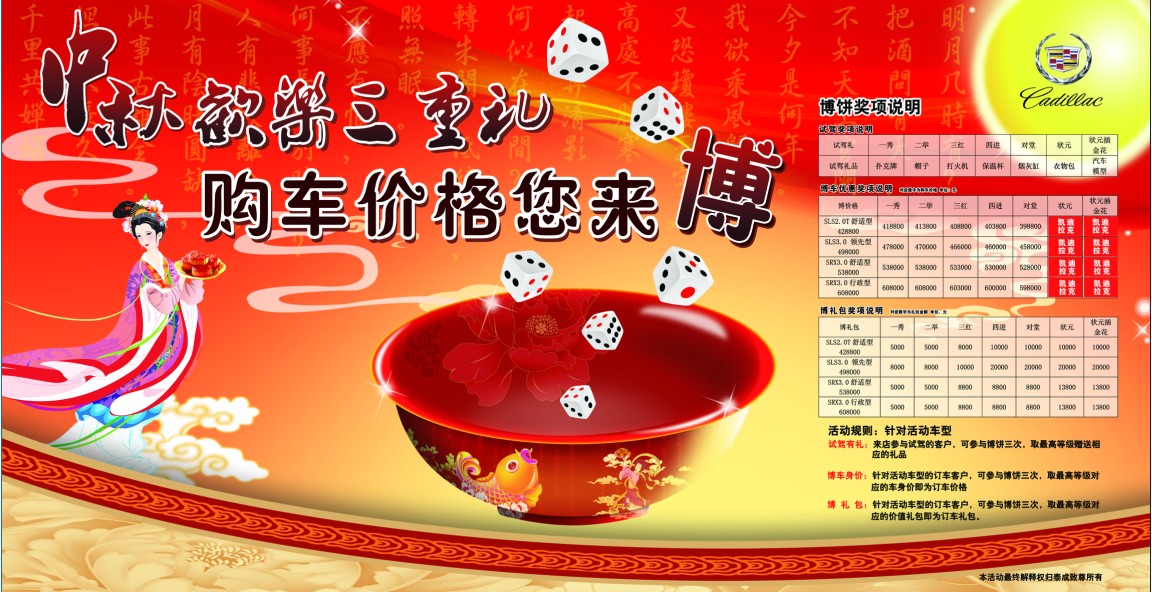 来店参与试驾的客户,可参与博饼,次数为三次,根据博得的等级赠送相应的礼品(以小礼品、抵用券为主)