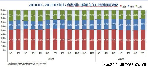 今年上半年相对于自主品牌的销量和份额下滑,合资车市场虽不及进口车的高速增长,却也取得了较好的成绩。日系车企深受地震影响,上海通用、上海大众、一汽大众等美系和欧系车企,以及北京现代等韩系车企趁势瓜分了自主品牌和日系下滑的市场份额。