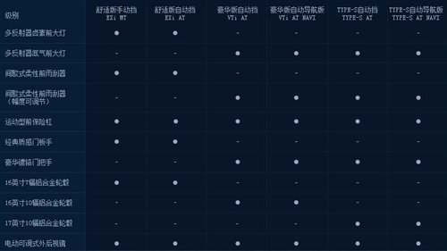 | 氙气前大灯 | 除舒适型外均配备 | 仅2.0L车配备 | 无 | 仅1.6T新锐运动版配备 | |